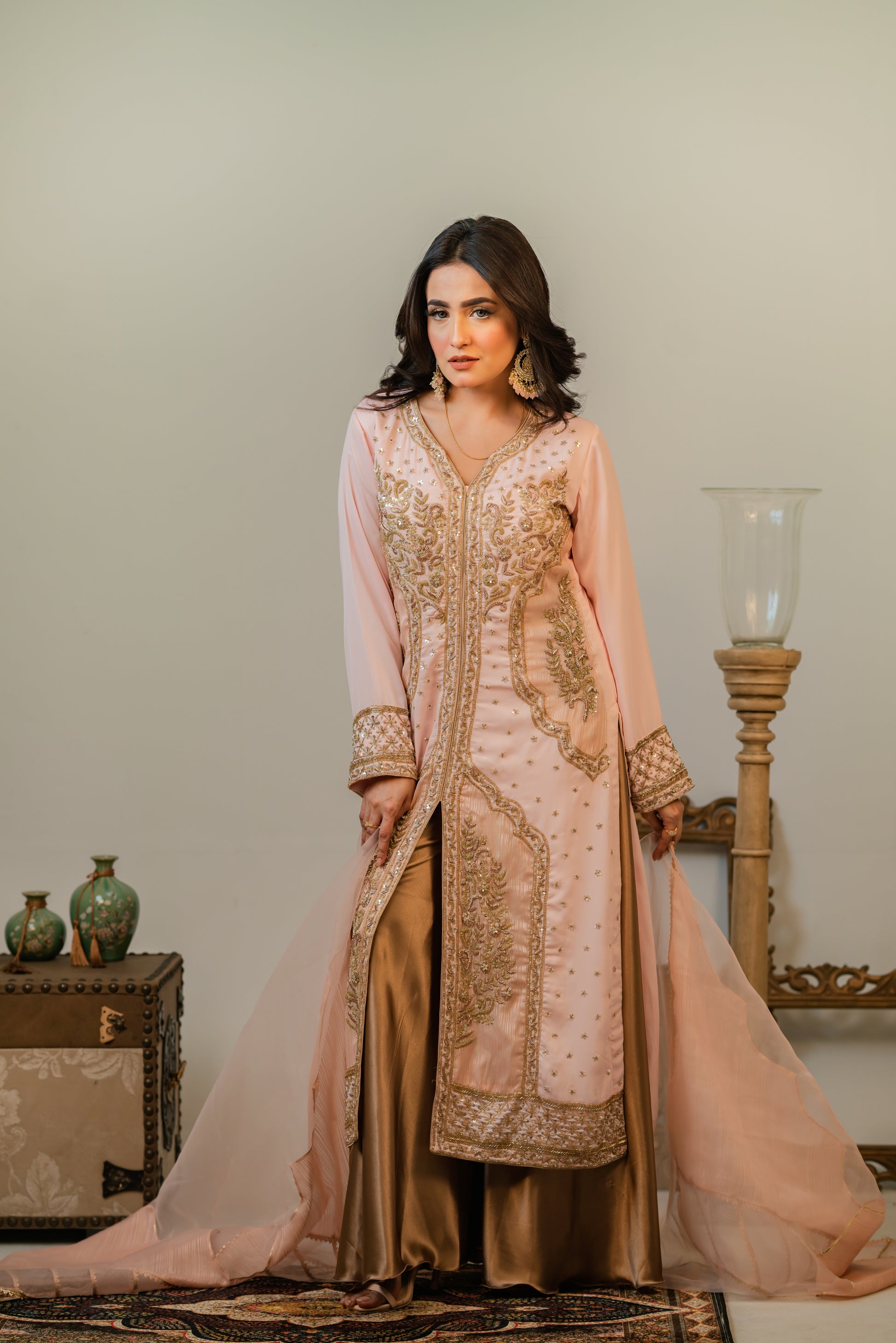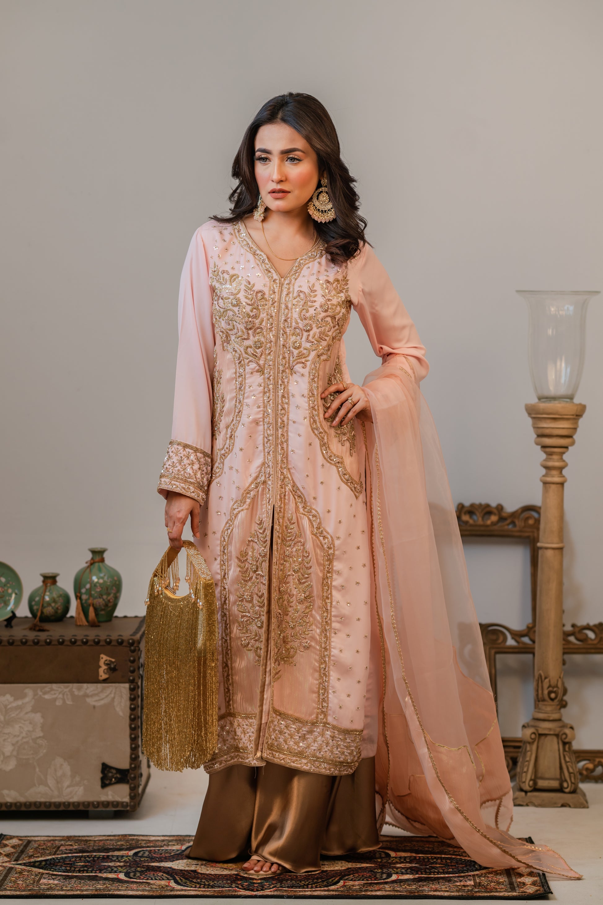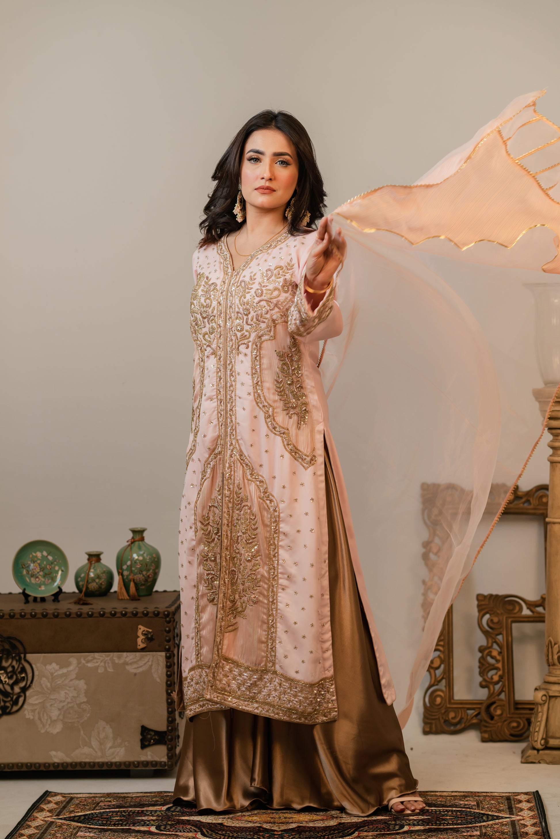 Step into timeless grace with this luxurious traditional outfit featuring a blush pink long kameez adorned with intricate gold embroidery and delicate embellishments. The front-open style is paired with a flowing gold satin sharara, adding a dignified touch to the outfit. A sheer chiffon dupatta with golden edging completes the look, offering a perfect blend of sophistication and cultural richness. Ideal for festive occasions, weddings, or formal celebrations.