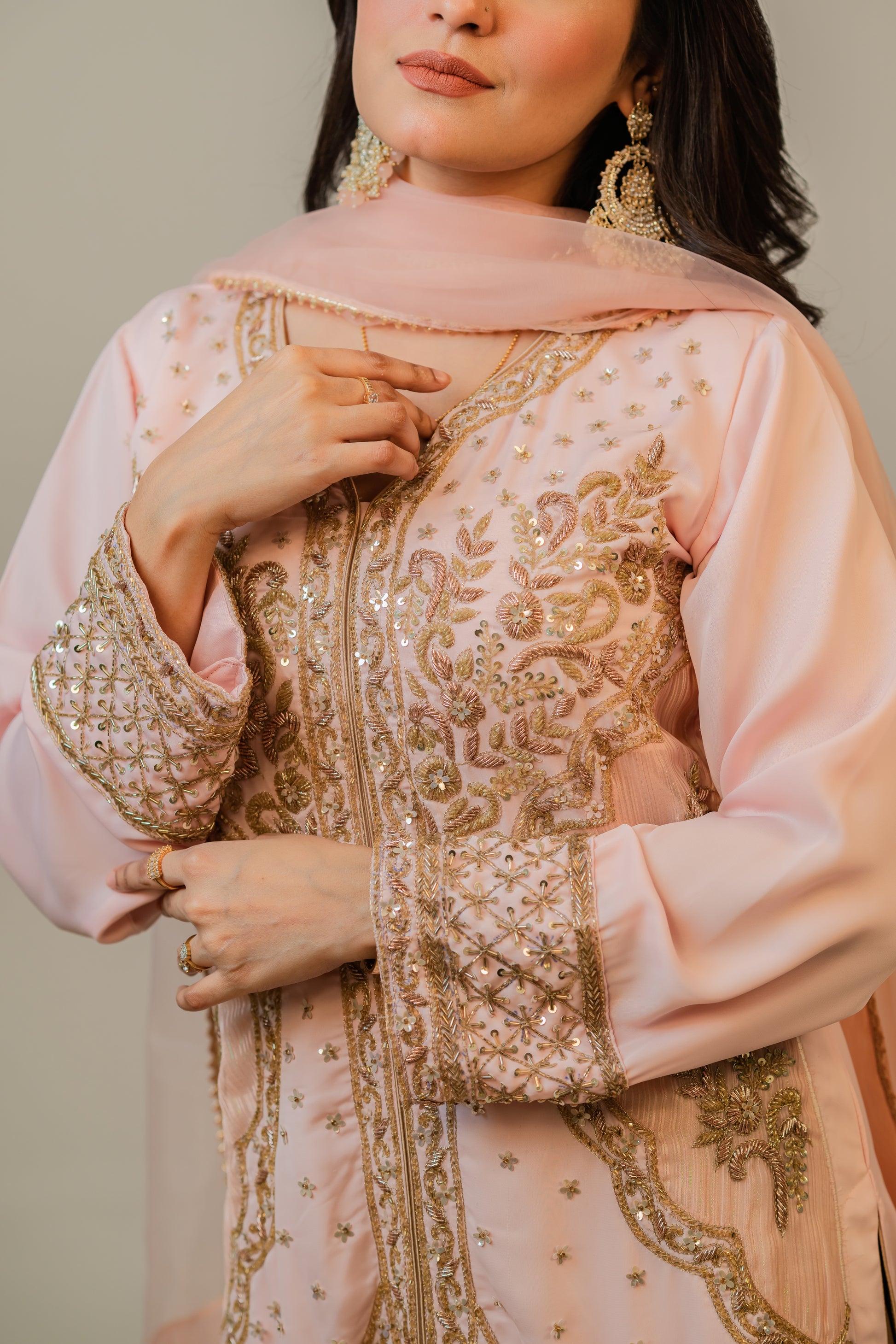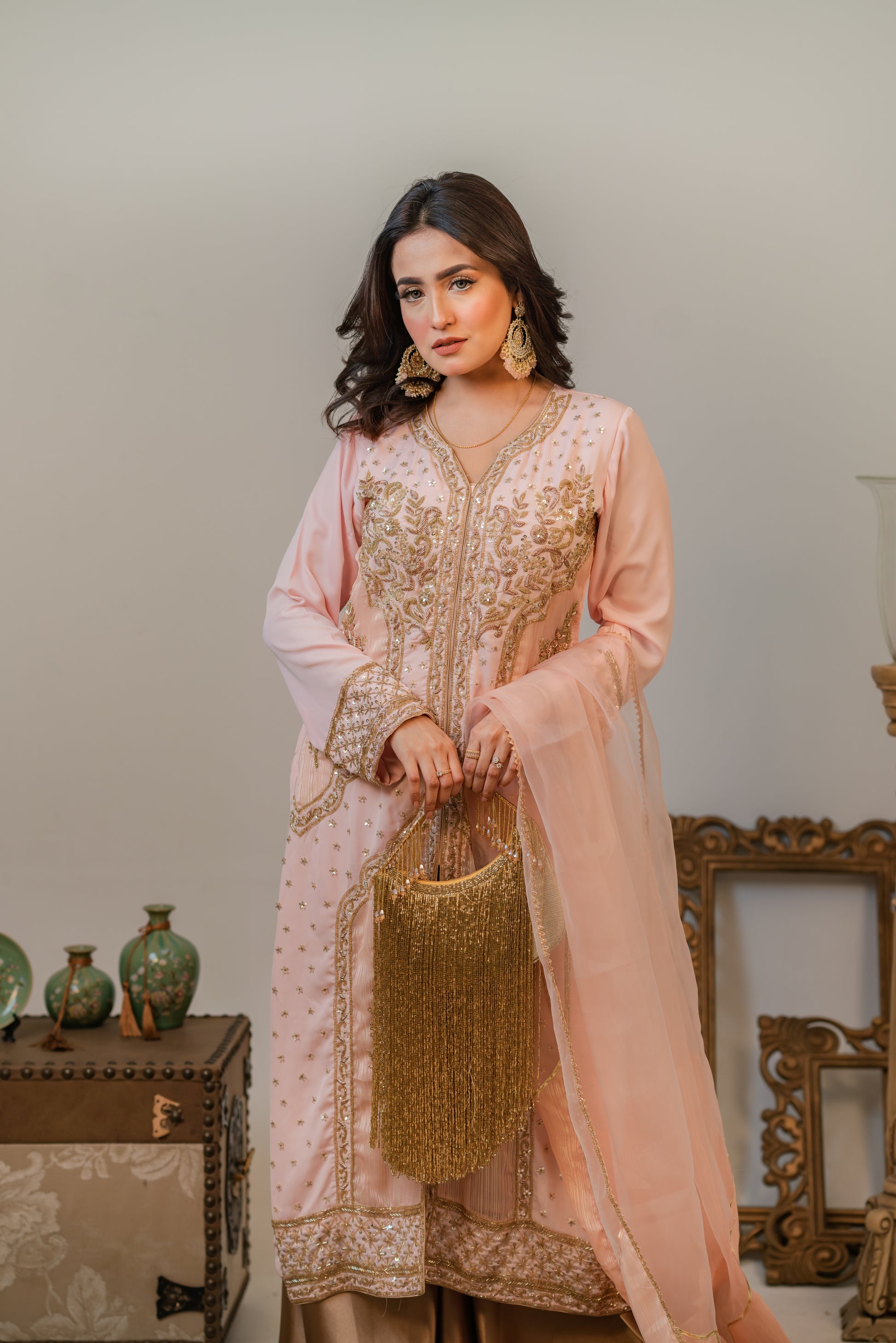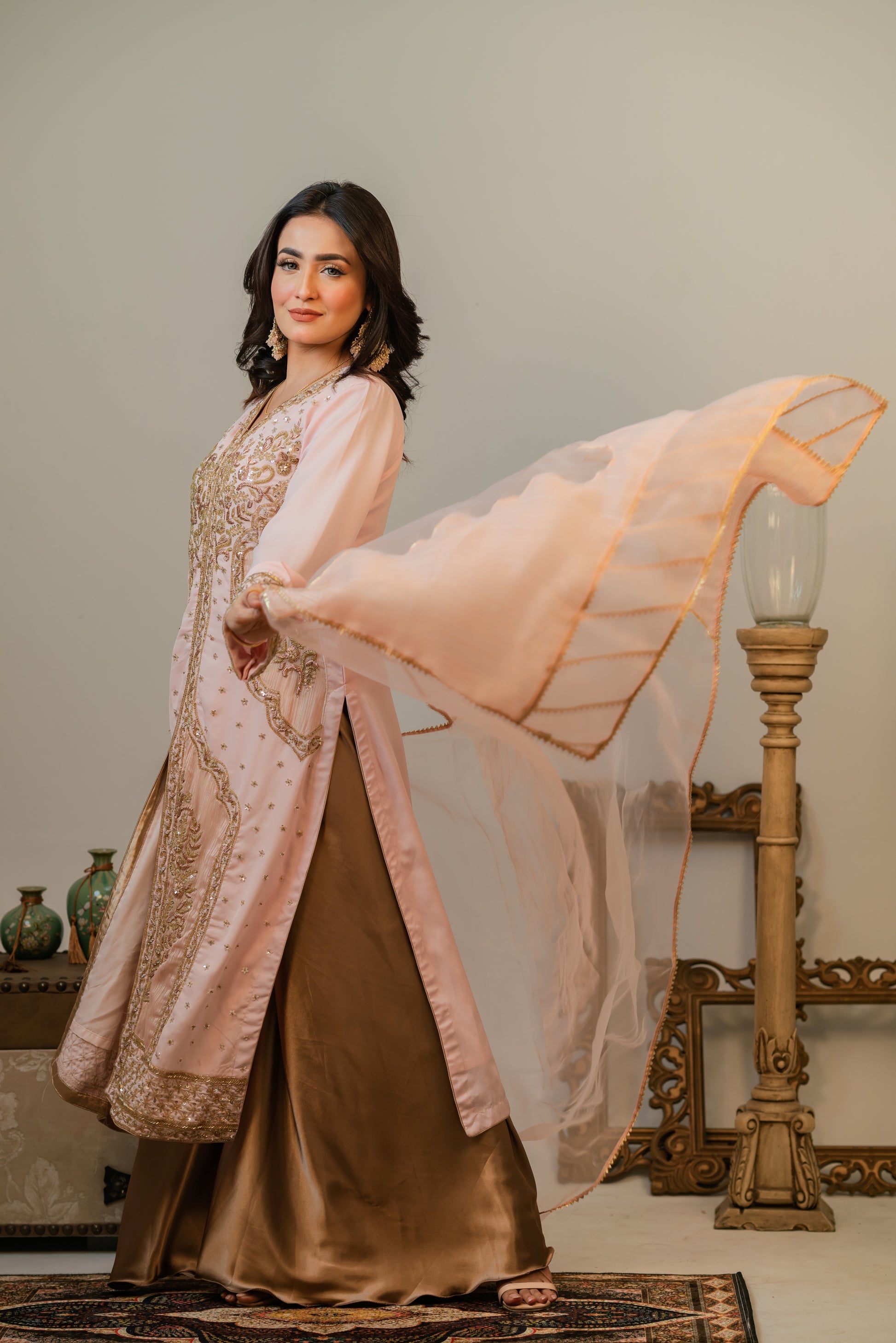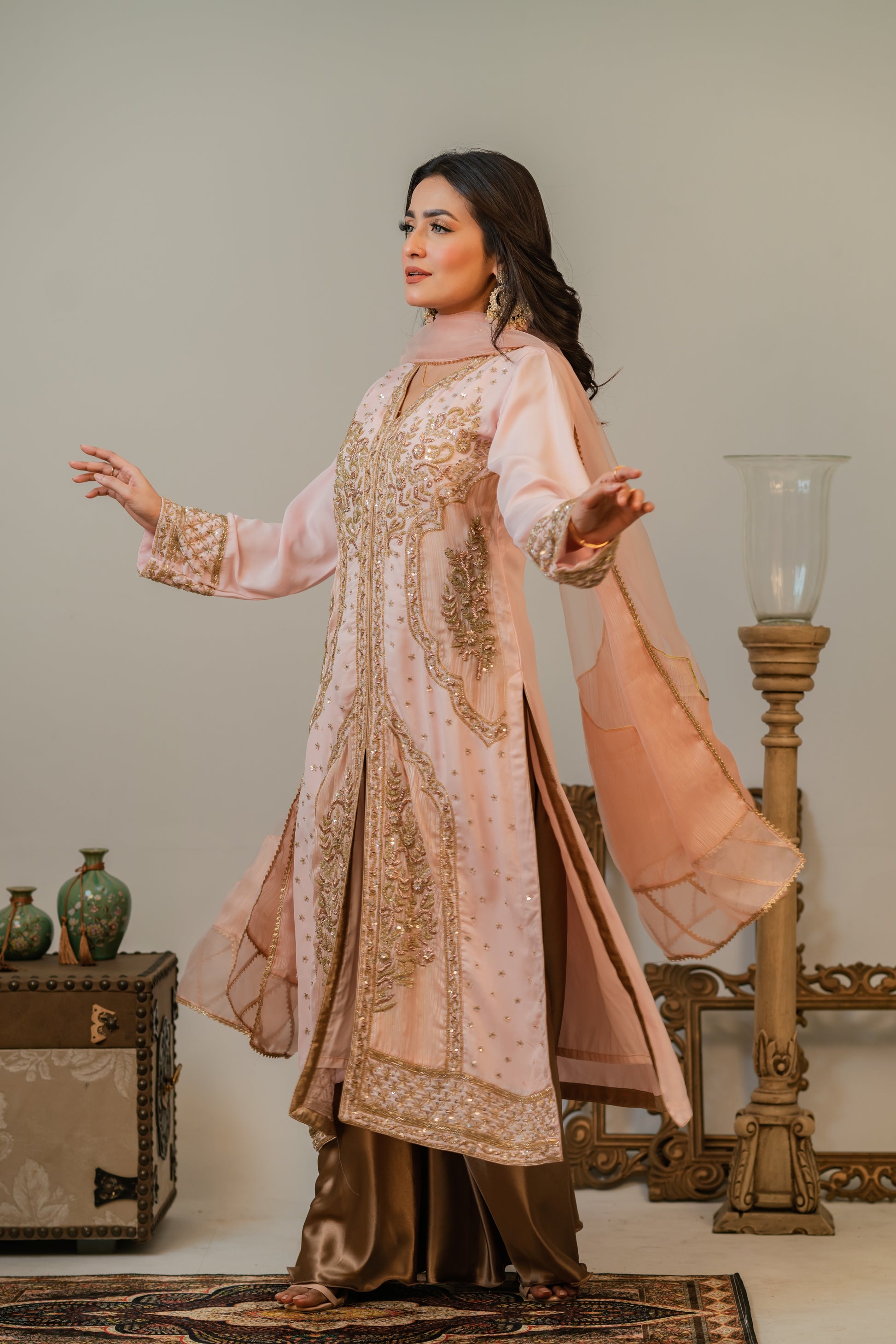 Step into timeless grace with this luxurious traditional outfit featuring a blush pink long kameez adorned with intricate gold embroidery and delicate embellishments. The front-open style is paired with a flowing gold satin sharara, adding a dignified touch to the outfit. A sheer chiffon dupatta with golden edging completes the look, offering a perfect blend of sophistication and cultural richness. Ideal for festive occasions, weddings, or formal celebrations.