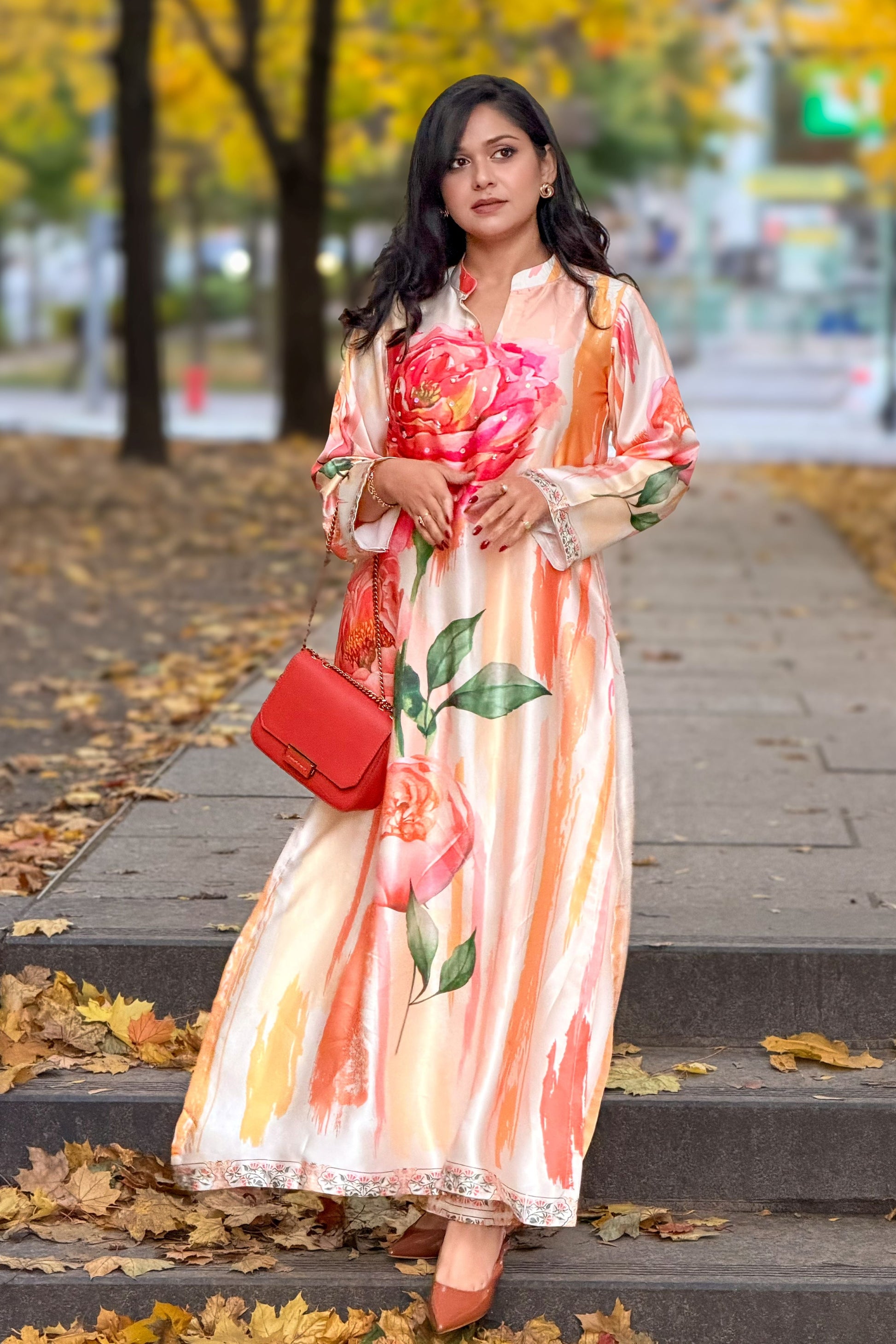 A graceful long dress featuring soft peach tones with bold coral floral prints that capture the warmth of autumn. The silky fabric flows effortlessly, while delicate detailing along the sleeves and hem adds a refined touch. Perfect for a day out or an evening gathering, this dress combines comfort, color, and charm in one elegant look.