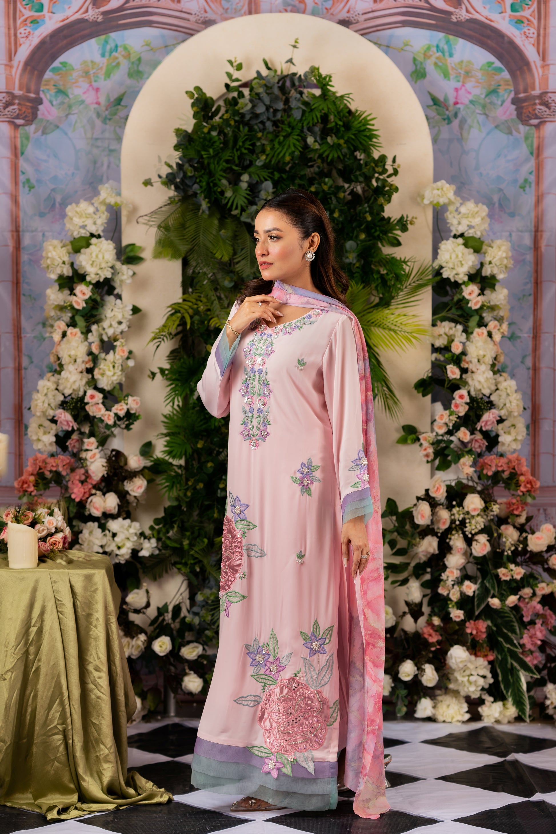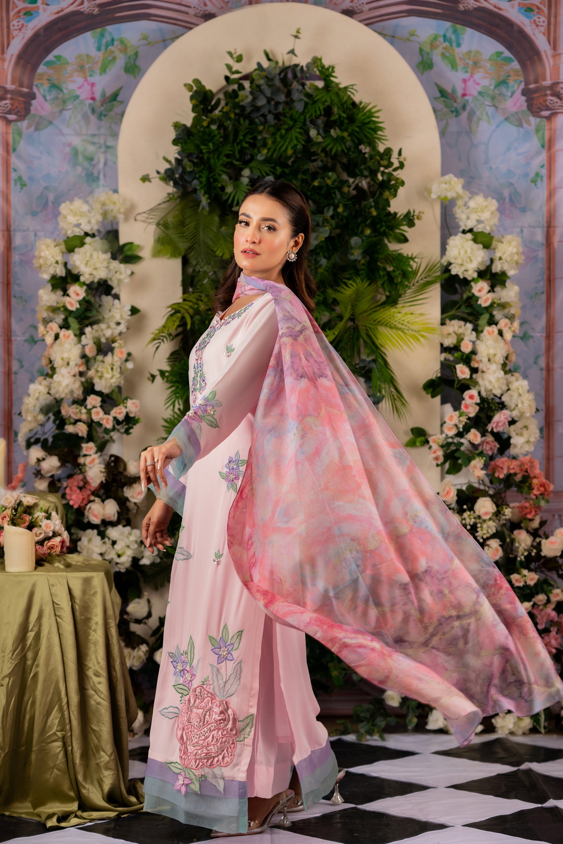 A graceful three-piece set in a soft blush pink tone, adorned with intricate floral embroidery in pastel hues. The kameez features detailed threadwork with blooming motifs, complemented by a lightweight, printed chiffon dupatta in dreamy watercolor shades. Paired with a matching bottom, this ensemble blends comfort and sophistication—perfect for festive gatherings or daytime celebrations.