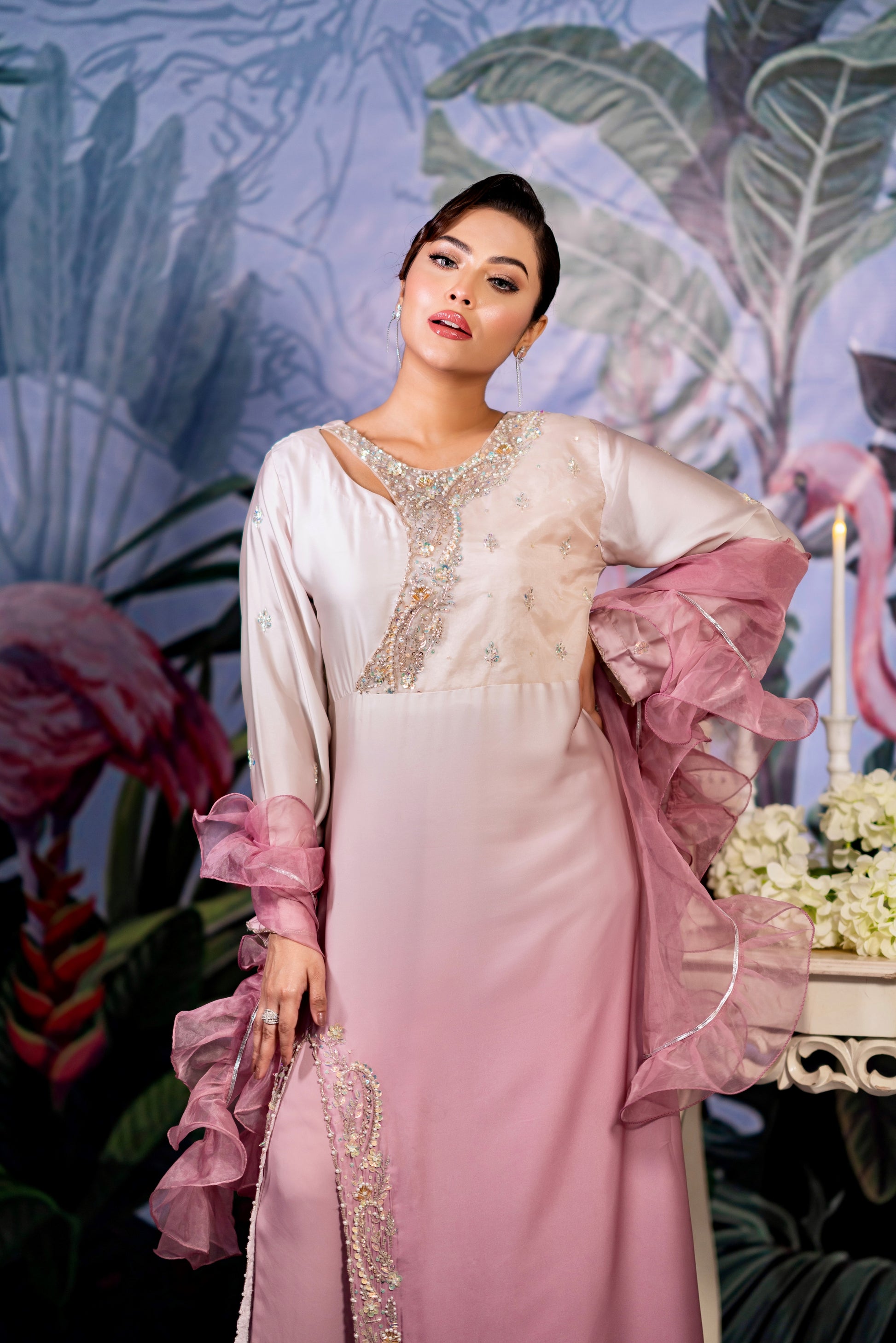 Exude timeless elegance in this ethereal blush-toned kaftan, featuring a graceful ombré transition from soft ivory to rosy pink. The asymmetrical neckline is adorned with intricate beadwork and delicate embellishments, adding a touch of regal charm. Flowing ruffled sleeves with sheer accents enhance the femininity of this ensemble, while the shimmering embroidered details along the hemline create a captivating finish. Perfect for festive occasions, evening soirées, or celebratory gatherings, this masterpiece embodies sophistication and grace.