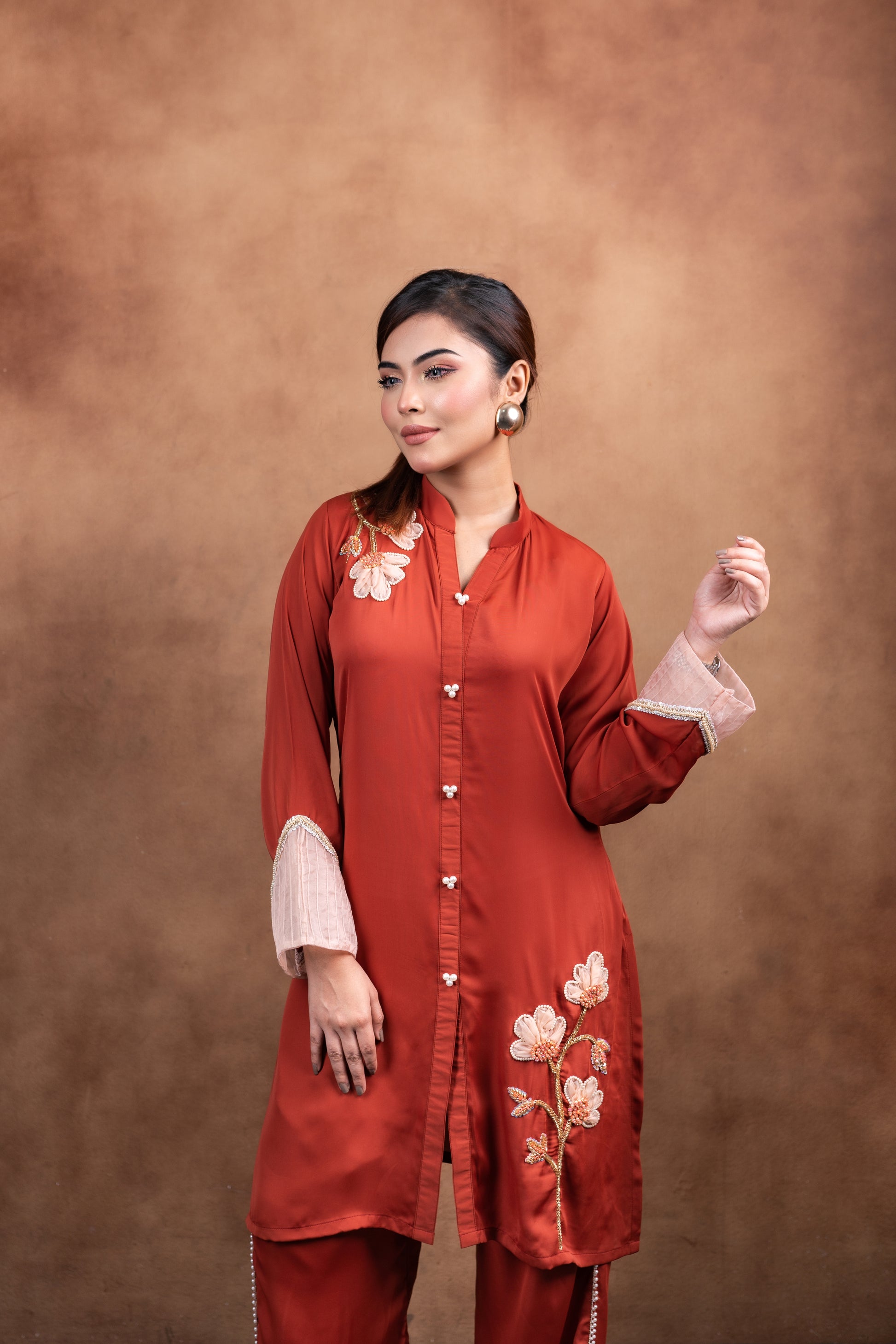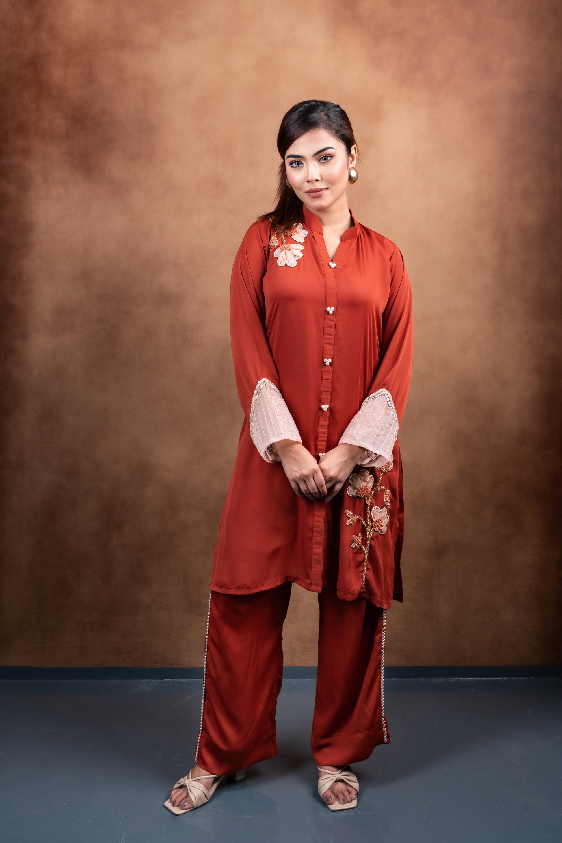 Embrace elegance with this brick orange kurti set, ideal for any festive occasion. The kurti features intricate floral embroidery down the side, enhancing its graceful charm. Matched with a similarly styled pair of pants adorned with delicate details, this set stands out with its harmonious design. Perfect for those seeking a sophisticated yet traditional look. Lightweight fabric ensures comfort without compromising on style, making it a must-have for your wardrobe.