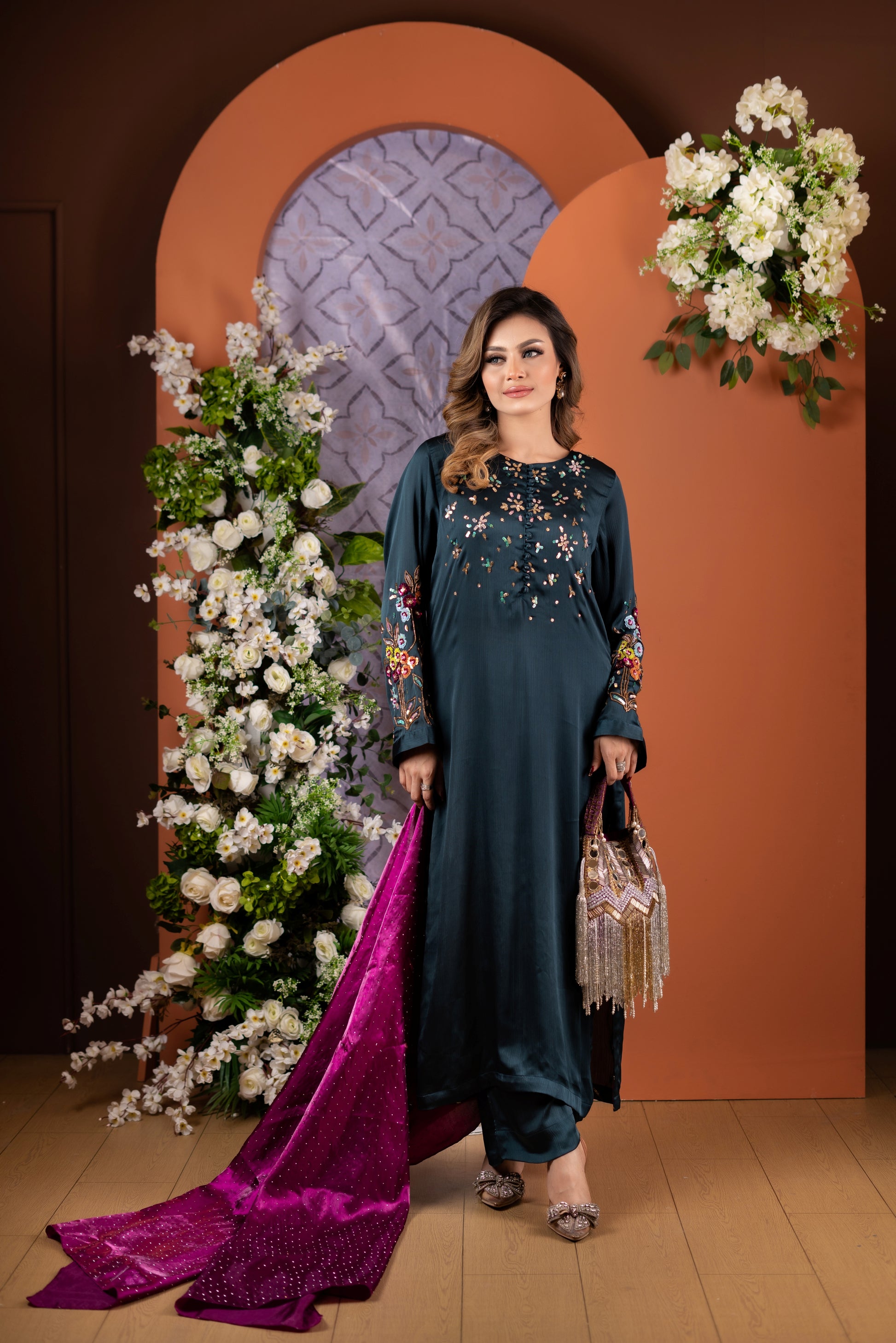 A dark teal kameez adorned with intricate floral embroidery on the front and sleeves, paired with sleek matching pants. A chic ensemble that balances elegance and modern simplicity.