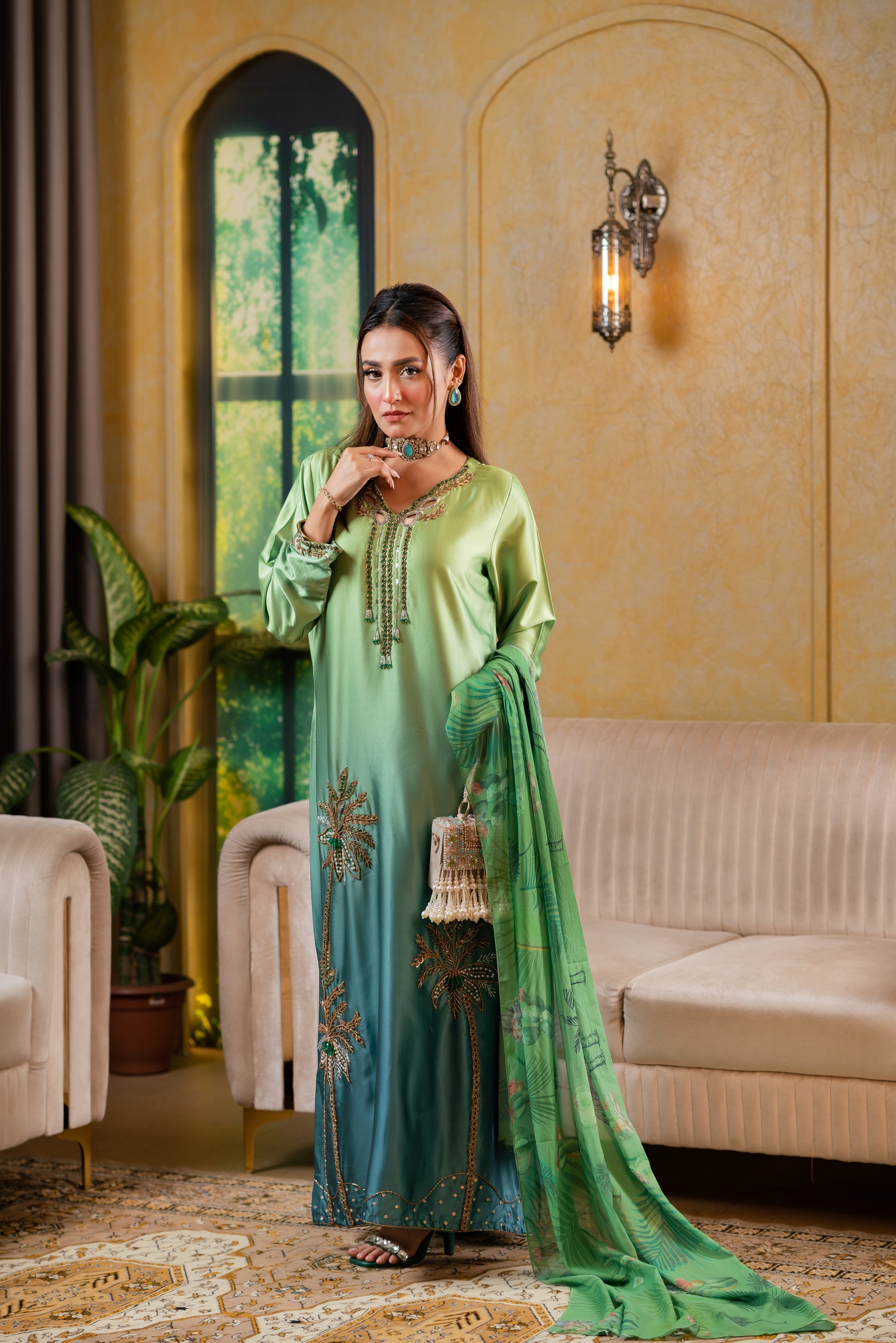 A sophisticated long kameez designed in a radiant green ombre shade, detailed with intricate embellishments and palm-inspired embroidery. Paired with a soft printed dupatta and delicate accessories, this piece is ideal for festive wear and evening celebrations.