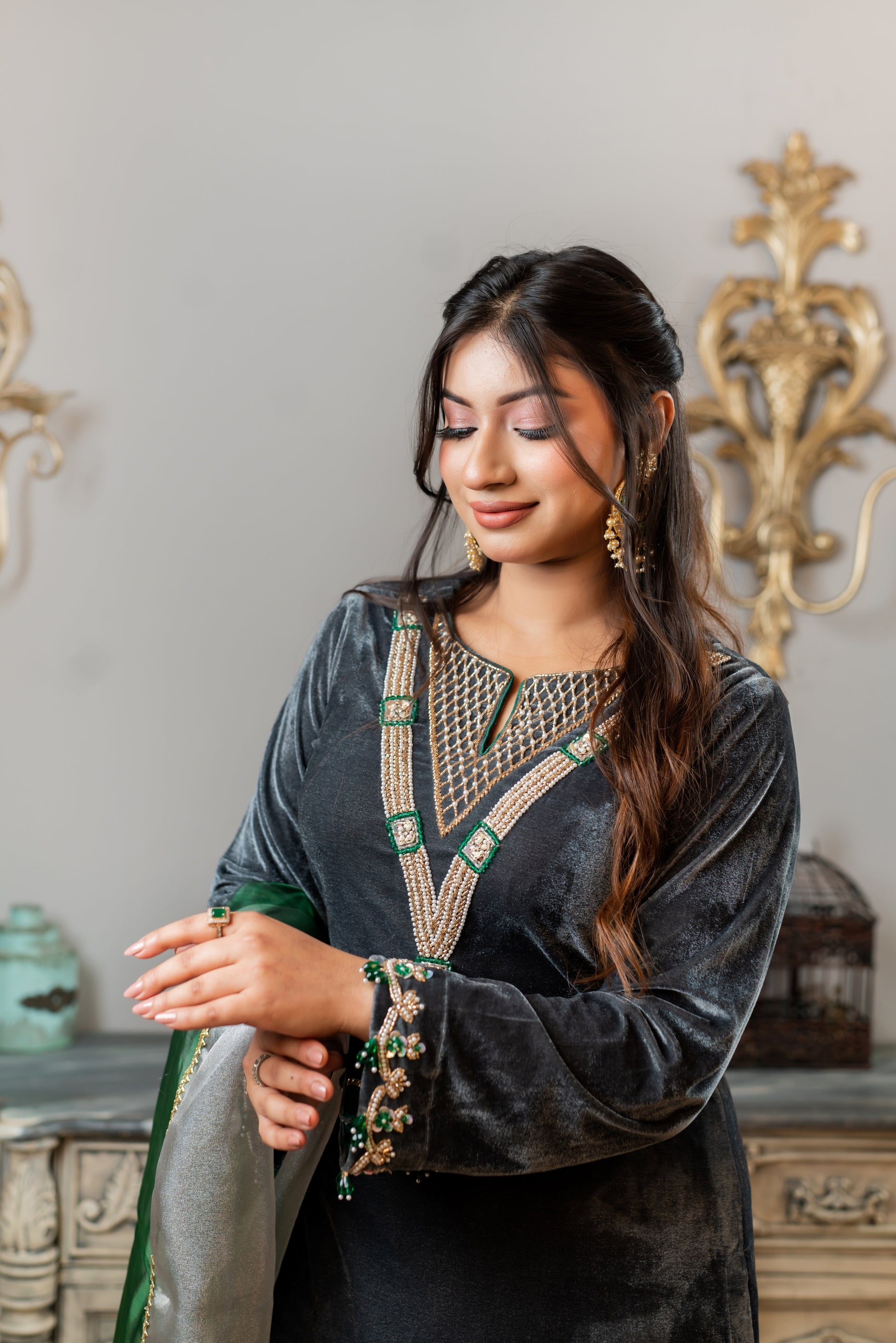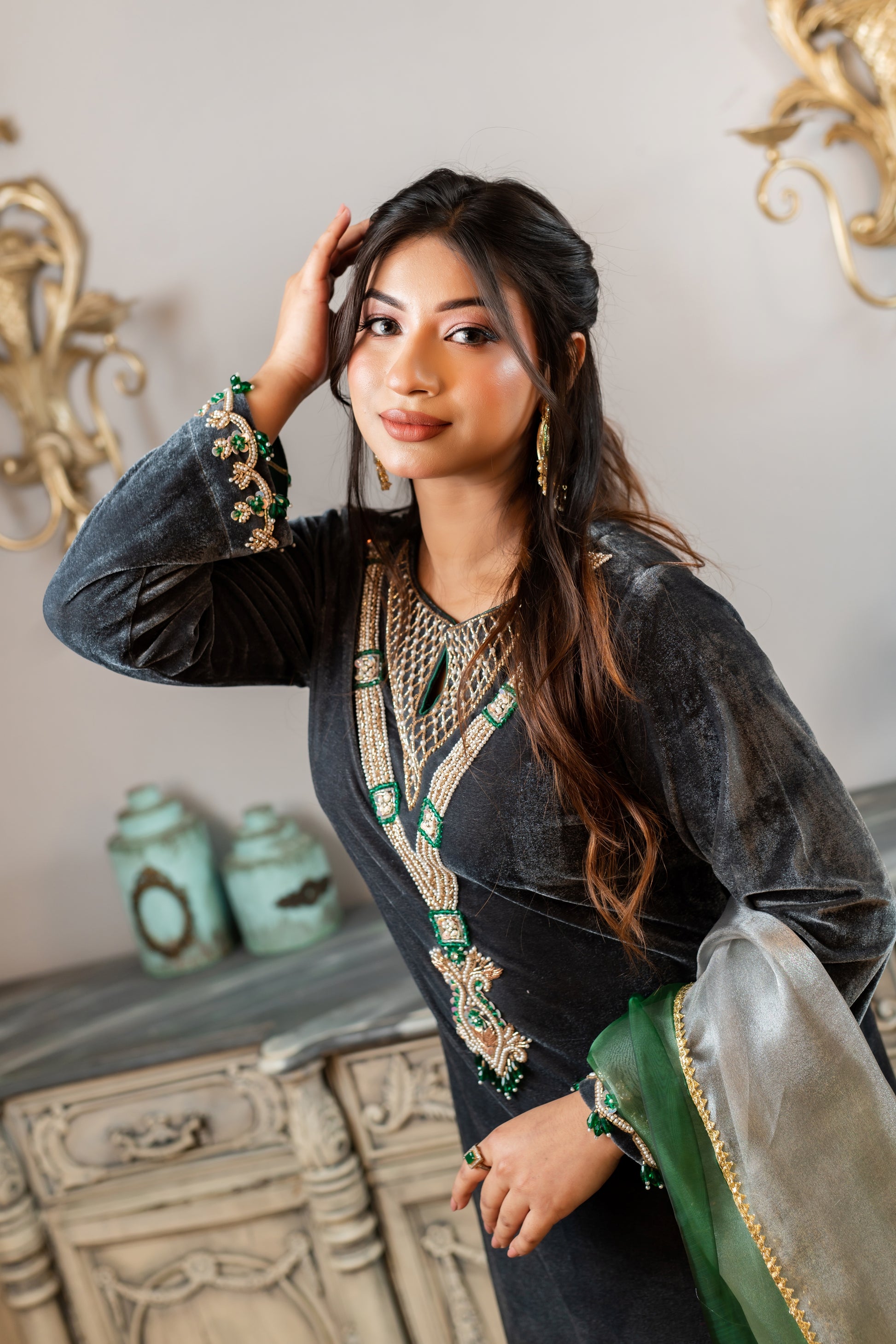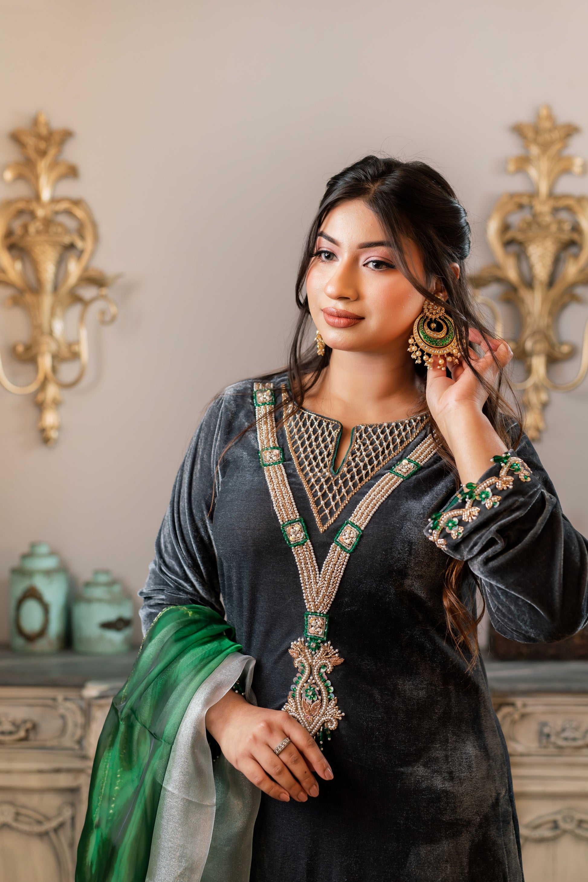 Elevate your festive wardrobe with this luxurious kameez and pant set. The rich, velvety kameez in an elegant charcoal gray shade is adorned with intricate golden and emerald green embellishments, featuring delicate beadwork and floral embroidery along the neckline and cuffs. The matching green pants are beautifully designed with golden accents, creating a graceful and coordinated look. Paired with a sheer dupatta in contrasting hues, this ensemble exudes sophistication and charm, perfect for weddings, parties, or any special occasion.