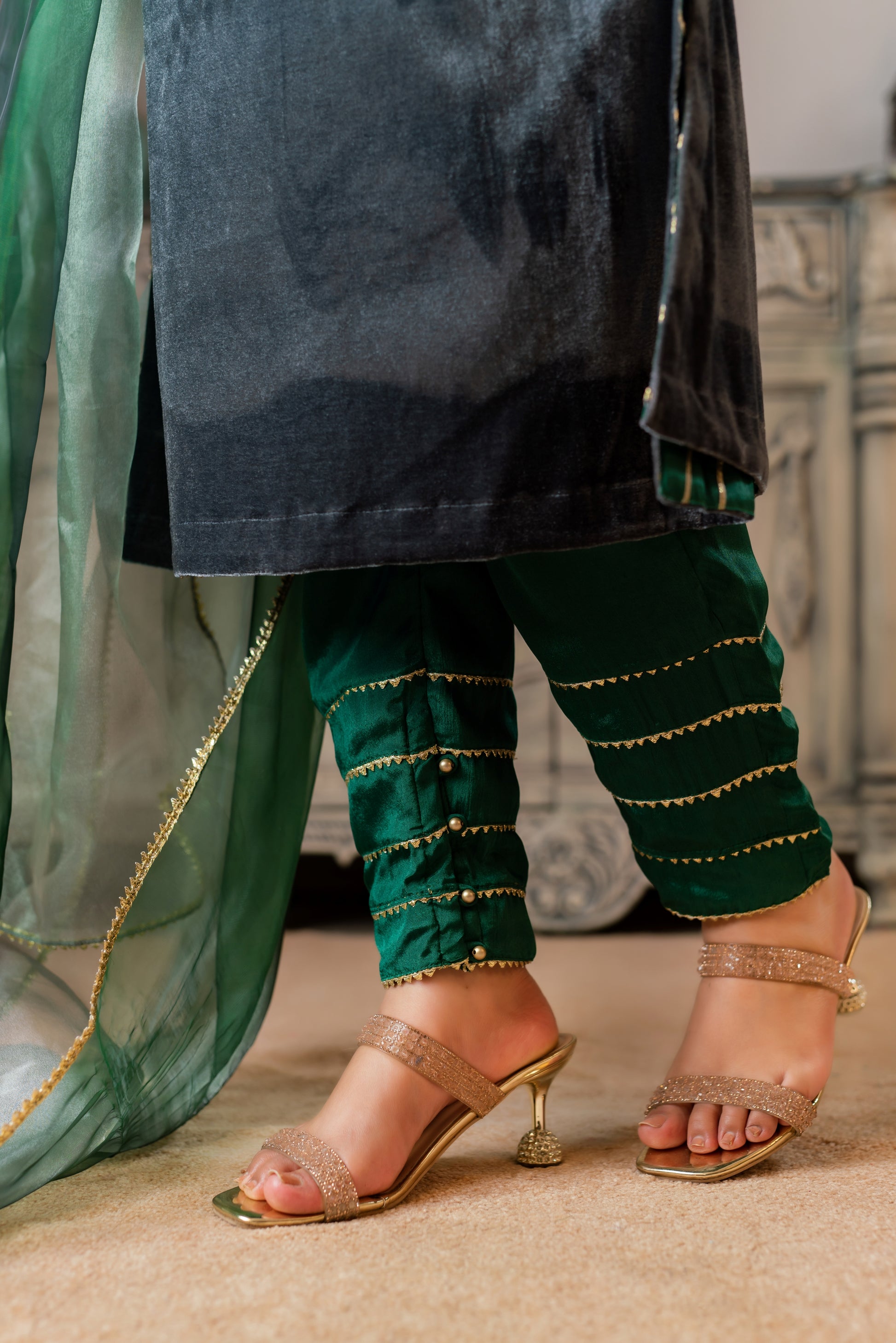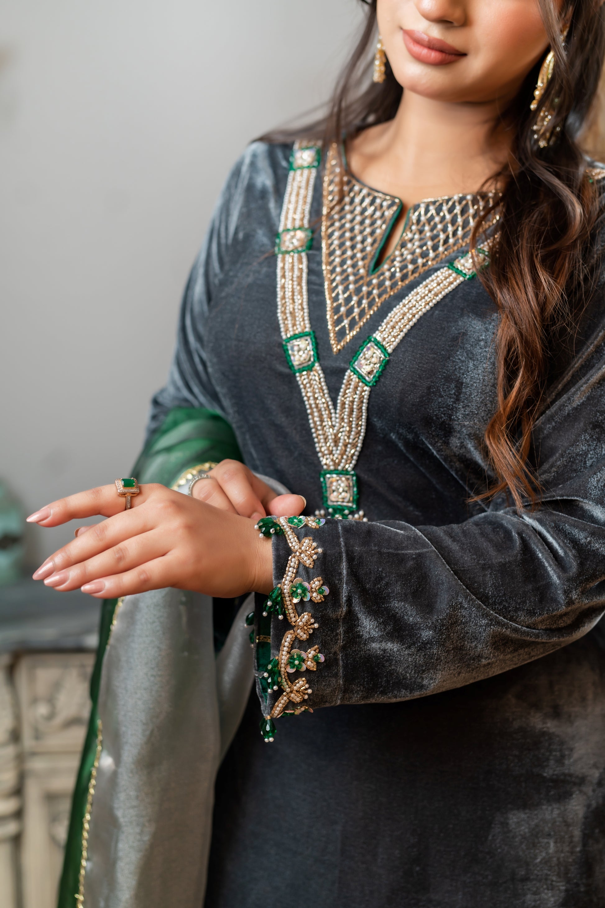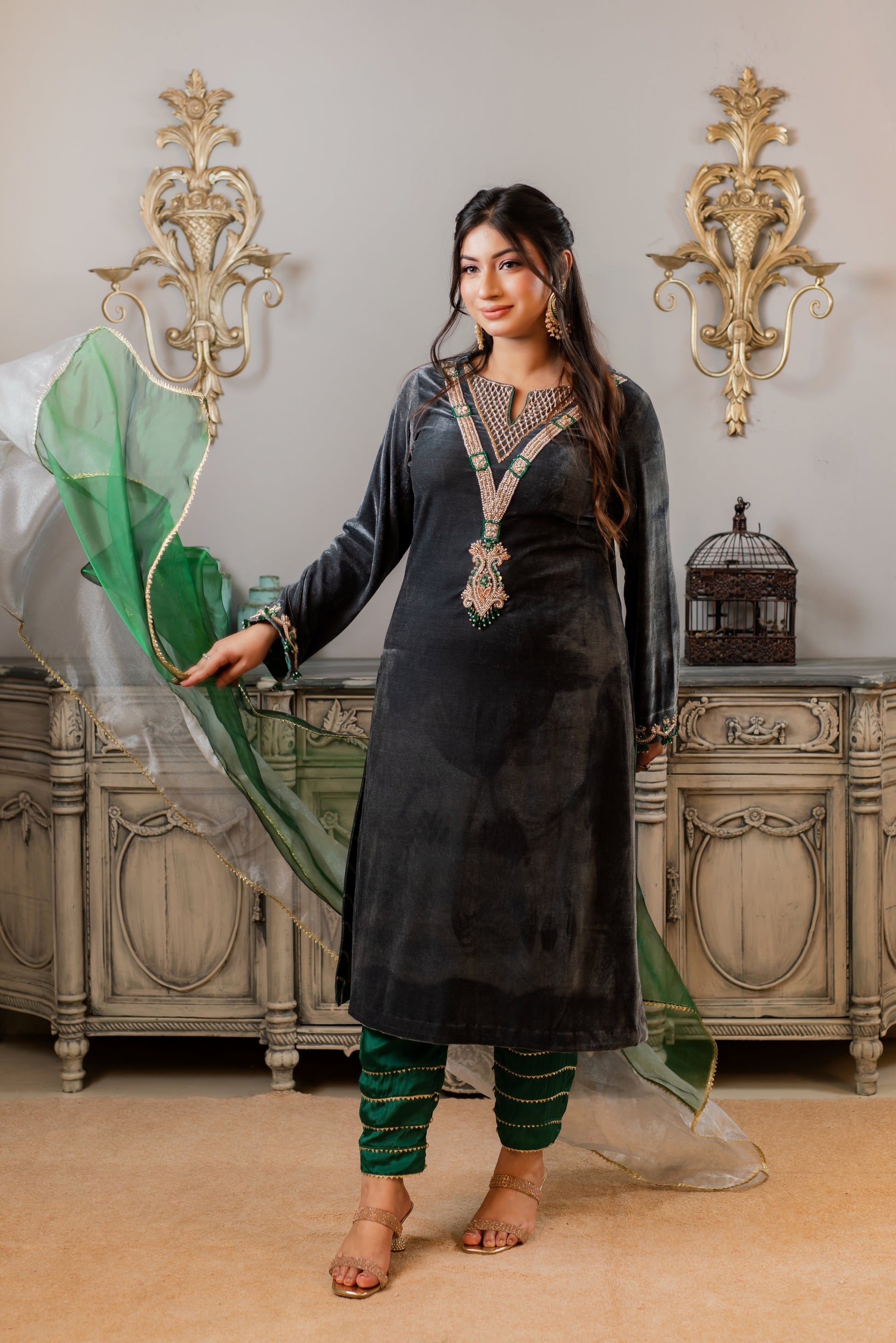 Elevate your festive wardrobe with this luxurious kameez and pant set. The rich, velvety kameez in an elegant charcoal gray shade is adorned with intricate golden and emerald green embellishments, featuring delicate beadwork and floral embroidery along the neckline and cuffs. The matching green pants are beautifully designed with golden accents, creating a graceful and coordinated look. Paired with a sheer dupatta in contrasting hues, this ensemble exudes sophistication and charm, perfect for weddings, parties, or any special occasion.