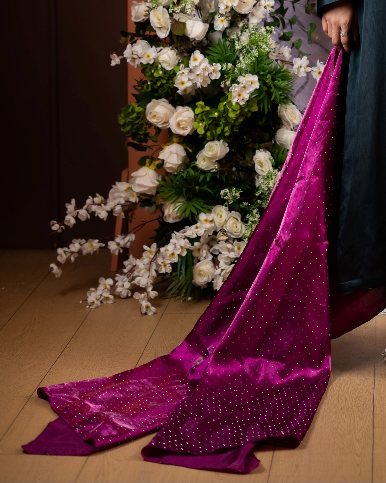 A timeless magenta silk dupatta detailed with subtle stonework, bringing a perfect balance of richness and grace. Ideal for weddings, parties, and festive occasions to complement your outfit with sophistication.