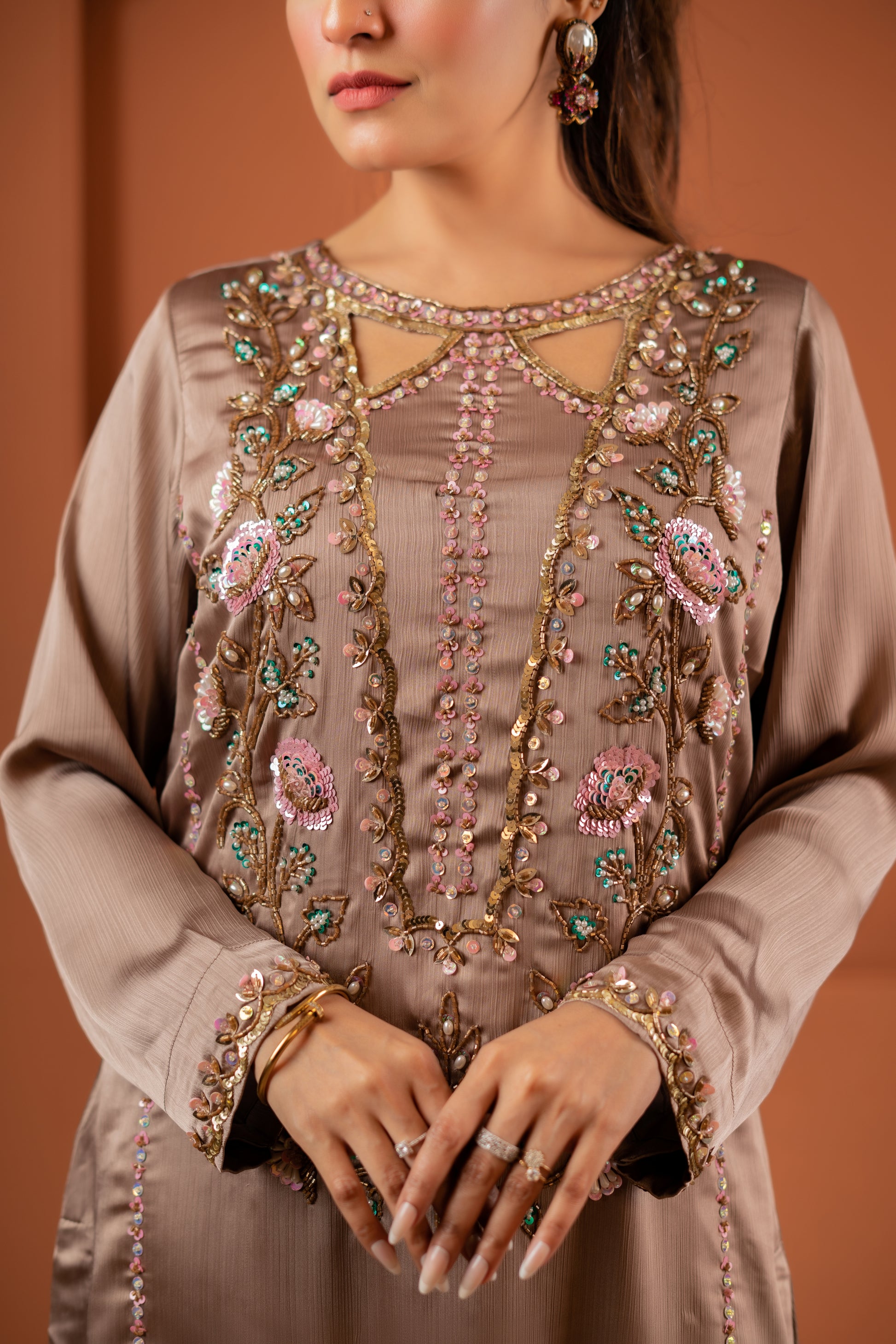 A graceful mocha-toned silk kameez adorned with intricate floral embroidery in soft pink and gold accents. Its rich sheen and elegant detailing on the neckline and front panel make it a refined choice for festive gatherings, weddings, and evening occasions.