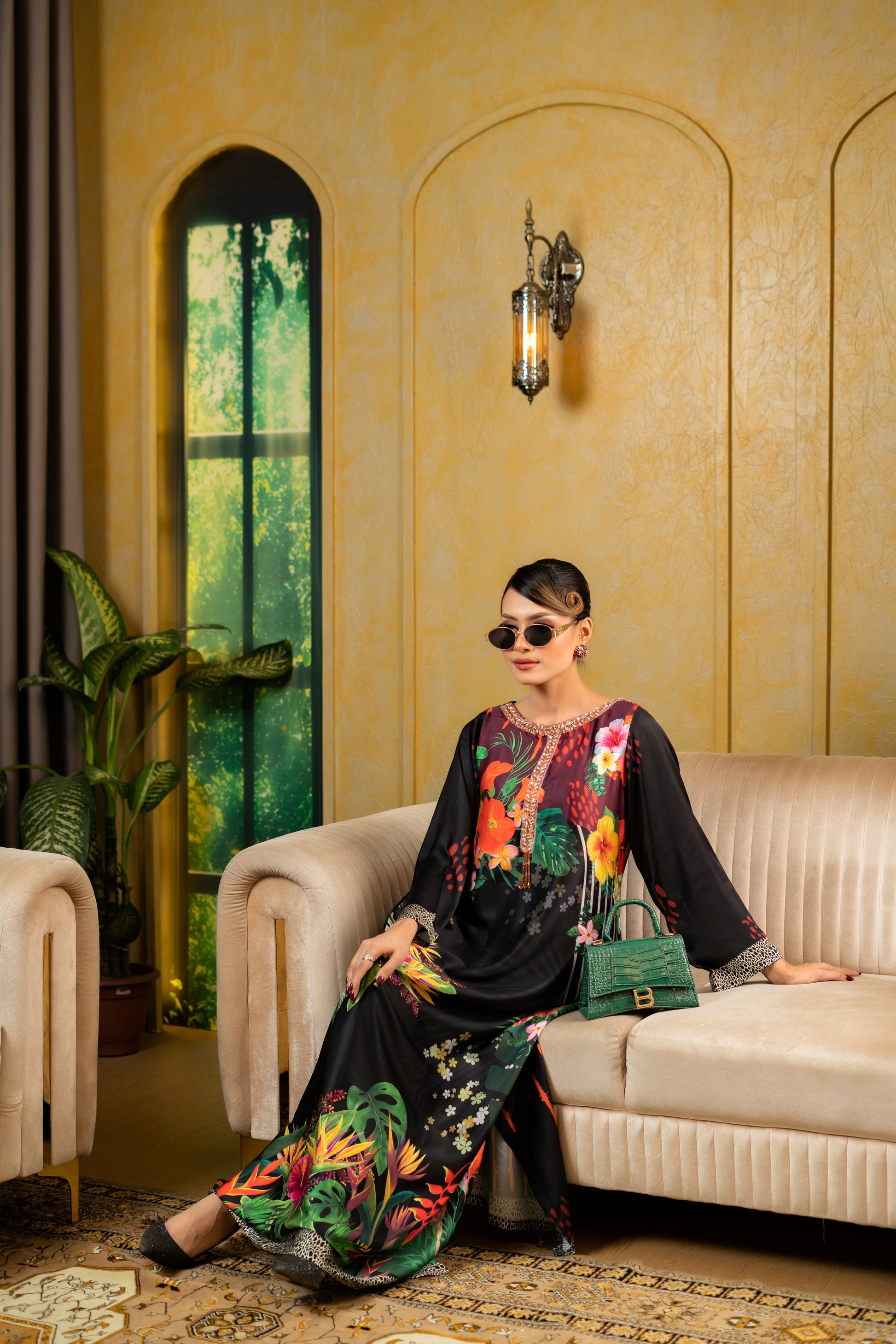 Embrace the allure of paradise with this kameez, showcasing bold florals against a sleek black backdrop. The relaxed cut, intricate detailing, and vibrant design make it a perfect blend of comfort and sophistication.
