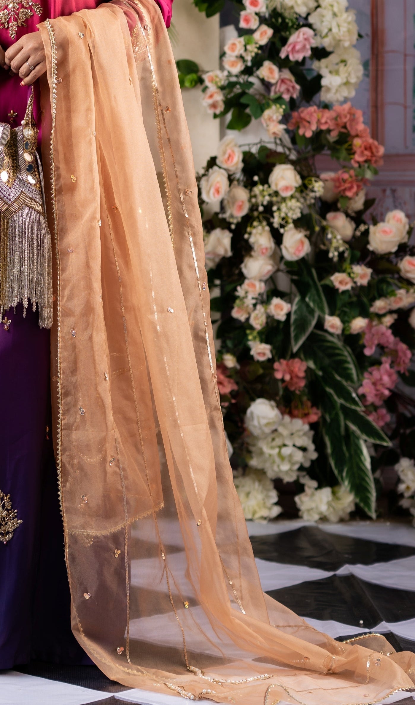 Add a touch of grace to your ensemble with this exquisite sheer peach dupatta. Made from a lightweight, flowy fabric, it features delicate hand-embroidered details and subtle sequin accents that catch the light beautifully. The scalloped edges and golden embellishments enhance its luxurious appeal, making it the perfect complement to both traditional and contemporary outfits. Whether draped elegantly over the shoulders or styled creatively, this dupatta adds effortless charm and sophistication to any look.